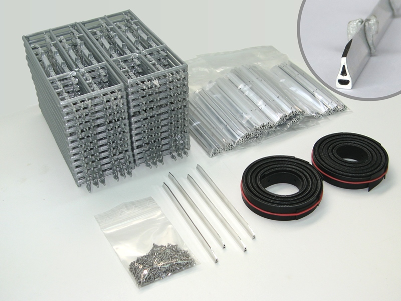 Neben den 104 vorgebohrten Kettenstegen umfassst der Satz sämtliche Beschlagteile, Gegenplatten für die Schrauben und natürlich die gewebeverstärkten Gummibänder.